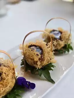 Another steamed dish was the Parisian Garden Crystal Blue Shrimp Dumplings, likely their signature item. Made with sashimi-grade blue shrimp, I’ve seen similar quality at 8½ Otto e Mezzo Bombana. The dumplings came in three different colors, beautifully shaped, and adorned with gold flakes—presentation was top-notch. However, the colored wrappers didn’t differ in taste, and the sticky texture of the dough made them a bit tricky to eat.