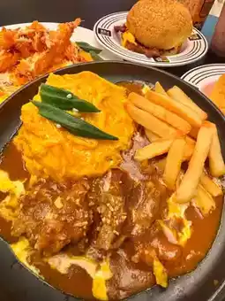 Fried Shrimp Omelette Rice: Crispy yet tender fried shrimp paired with soft omelette and rice, offering a rich and multi-layered texture.