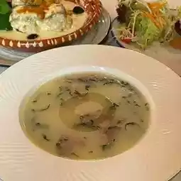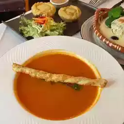 Rich and tangy tomato soup filled with chunks of fruit, paired with crispy puff pastry rolls. Once dipped, the rolls soak up the soup, blending soft and crispy textures that instantly captivate your taste buds.