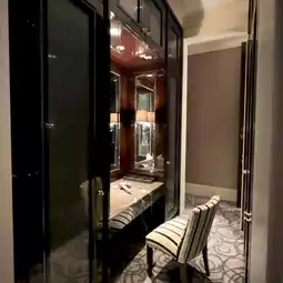 A bathroom so big that you can get lost in it is absolutely epic! The **black onyx massage bathtub** in the center can accommodate 6 people. When you pour in the bath salt, the butler will light the sandalwood essential oil that is prepared synchronously. The dressing room has a hidden secret - by pressing a button, the entire mirror cabinet rotates into a **professional dressing room**, and even the hair dryer is a gold-plated Dyson limited edition.