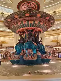 Upon entering the hotel, you'll be greeted by the Neptune Fountain, which changes colors and is perfect for taking photos. The space is grand, and above the second floor, there is a large shopping mall with a luxurious and extravagant dome ceiling to admire.