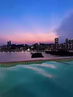 The swimming pool is located on the upper floors of the hotel, and the glass boundary design facing the street allows unobstructed vision. During the day, the sun shines on the water, and the blue sky and white clouds and the steel structure of the Macau Tower form a wonderful reflection in the water; in the evening, the sunset gilds the tower. At this time, leaning against the pool to take a silhouette, the outline of the building overlaps with the light and shadow of the water waves, and the atmosphere is directly maximized. It is recommended to wear a plain swimsuit and use contrasting colors to highlight the layers of the picture. Remember to bring a waterproof phone case. Underwater upward shooting can capture the magical perspective of the tower tip passing through the water~