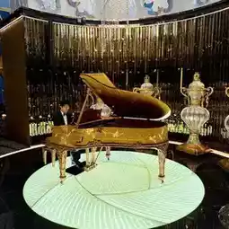 ✨ As you step into the restaurant, the massive chandelier adorned with 130,000 Swarovski crystals immediately catches your eye. Nearby, a handcrafted German wooden piano sets the stage for live performances of world-famous melodies, creating an unparalleled dining ambiance 🎵