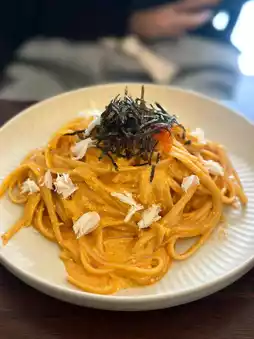 Must-try dish: "Crab Meat Mentaiko Linguine"! Springy noodles coated in rich mentaiko sauce, complemented by sweet crab shreds and topped with nori flakes—it's the ultimate "Japanese soul combo." The "Full Energy Breakfast" is a feast: sunny-side-up eggs, grilled sausages, mixed vegetable salad, and golden crispy toast—perfect for big eaters! For drinks, the "Pandan Coconut Coffee" is a standout, blending pandan aroma with coconut milk and coffee for a unique flavor explosion that deepens as the ice melts. The "Iced Roasted Tea Latte" is more conventional, with a light tea flavor ideal for those who prefer a refreshing taste.
