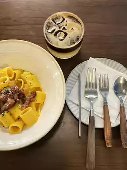 🍝 Carbonara Round Pasta Full of surprises! The round noodles are super sauced, the Parmesan cheese and mayonnaise are so thick that they are stringy, the bacon is garnished with salty fragrance, and paired with lemon bubbles to relieve greasiness, it is the most harmonious combination I have eaten recently;