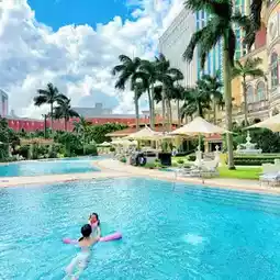 The azure blue water blends with the Macau skyline, backed by luxurious buildings, and the front view is unobstructed! During the day, the sun shines on the water, and the water is sparkling. Any photo taken is an Instagram blockbuster📸 In the evening, the sunset dyes the sky pink and purple, and the reflection on the pool is romantic. Book it directly in the circle of friends!