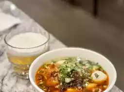 📍 Our favorite menu item? Definitely the noodle station! We asked for Hong Kong fishballs only, added chili paste and some spicy peanuts, and paired it with the foamy chrysanthemum tea. It was so delightful that we didn’t want to leave for our flight!