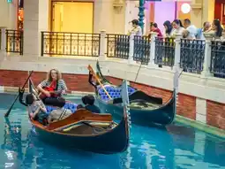 The Venetian Hotel: A vibrant atmosphere under a daytime ceiling with artificial canals and gondolas.