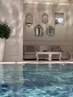The soft pastel-toned walls and the clear blue water combine to create an elegant ambiance. Immersing yourself in the pool feels like indulging in a moment of royal relaxation, completing a unique sense of leisure. 🎨💙🏖