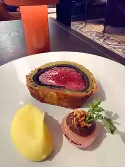 The steak Wellington has a perfectly crispy and fluffy crust, filled with mushrooms, black truffle mushroom puree, mashed potatoes, onions, and more. Most importantly, the beef is cooked just right, leaving it perfectly tender. A red wine sauce enhances the flavor, and my child likes to have a side sauce.