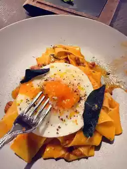 This homemade linguine is springy and topped with a fried duck egg and aged Parmesan cheese. The flavor is rich and smooth, and each bite is incredibly flavorful.