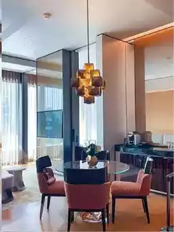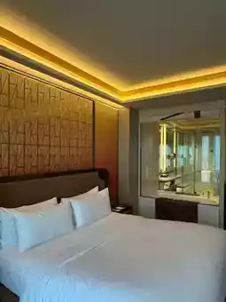Pushing open the room door, you'll feel the bustling activity outside the floor-to-ceiling windows during the day. At night, the floor-to-ceiling windows reveal a scene of dazzling luxury and extravagance. The room's custom bedding and fragrance will make you feel a sense of belonging, unparalleled relaxation, and comfort.