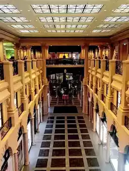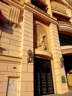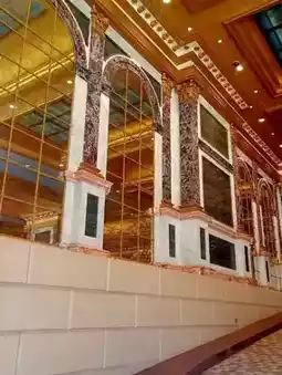 The interior design is inspired by the Palace of Versailles, and features a replica of the Fontaine de Mers fountain in the lobby. The Arc de Triomphe stands in front.