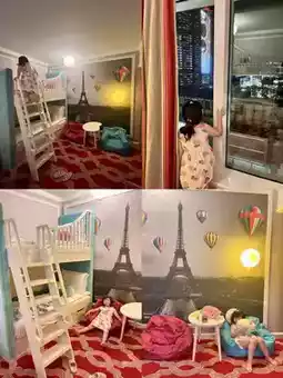It's simply a stroller and unwinding artifact! Guests can enter for free 🆓, wearing a bathrobe from the room ~ The area is not large, but there is a pirate ship slide and children's shallow water area, and you can swim while looking at the Eiffel Tower 🏊♀️, the experience is full!