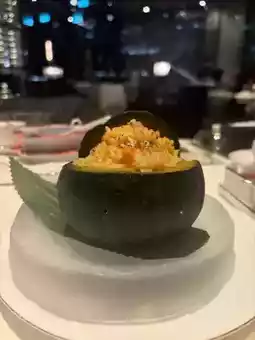 🌟 Baked Pumpkin with Seafood and Crispy Rice: The pumpkin is creamy and smooth, filled with fresh seafood, and topped with crispy rice for added aroma and texture.