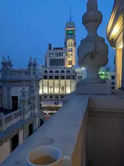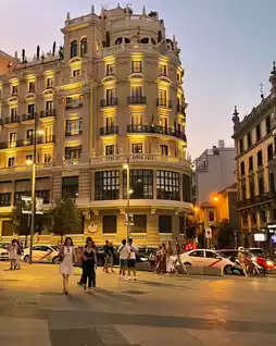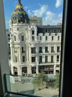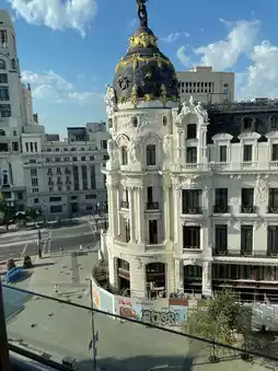 ⛪️ The hotel is a beautiful building with a stunning dome design. From here, you can enjoy the beautiful scenery of Gran Via Avenue. The hotel is located in the city center with convenient transportation, whether by subway, taxi, or bus. The interior of the hotel is beautifully decorated with a stylish design and unique artistic decorations.