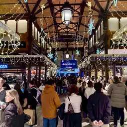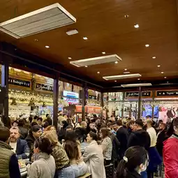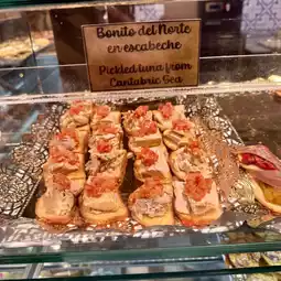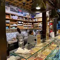 Its classic exterior, made of iron and glass, is captivating, while inside, you'll find a diverse array of food offerings, including tapas, seafood, jamón, draft beer, Spanish wine, and sweets.