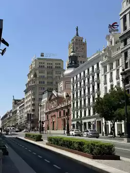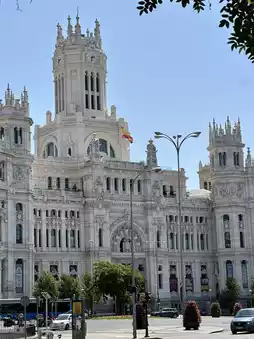 Stroll down to the Metropolis Building (C. de Alcalá, 39)—the ornate dome and winged statue make it a classic “Madrid skyline” capture, best lit in late afternoon glow. Right after, walk over to Plaza de Cibeles and the Cibeles Fountain; both are open 24/7 and are illuminated beautifully after dusk, making for magical nighttime photos. For a quick snack break, lots of nearby cafés offer a perfect perch for people-watching, so grab a cortado before you continue.