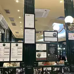 The shop's retro and elegant exterior, with its green and white wooden sign, evokes the feel of an old European café. Stepping inside, you're transported to a 19th-century literary salon: marble tables, vintage chairs, and walls covered with celebrity photos and news reports.