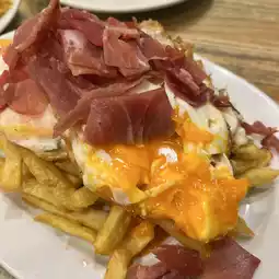 A signature dish of Fatigas! This simple yet soulful dish features crispy fried potato strips topped with two sunny-side-up eggs. Once you cut into the yolks and mix them with the fries, every bite is coated in rich, creamy egg goodness. Often served with jamón (ham) or chorizo (sausage), it's a salty, indulgent treat that bursts with happiness in every bite!