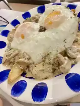 Boldly cut crispy fries with a soft-boiled egg and mushroom cream sauce. The aroma of the mushrooms was so amazing I forgot about the junkie vibe and finished it in no time. 😋