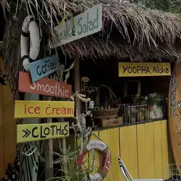 • Open-air cafe mixed with a small bar on the side of the road, surrounded by trees covering the entire shop