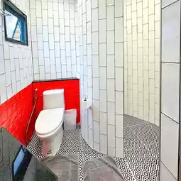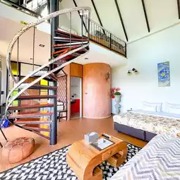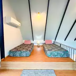 🏡 2 lofts: There are two houses, each suitable for two guests. These duplex-style houses have a half-story living area and bathroom on the ground floor. The upper level houses a king-size bed.
