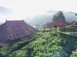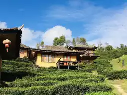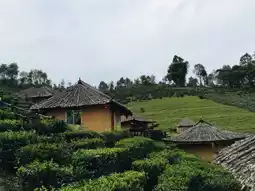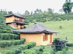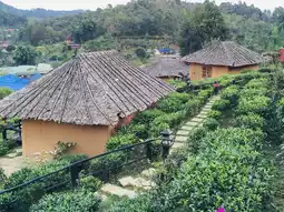 A resort with adobe houses in the middle of a tea plantation, surrounded by cool air and a romantic lake view