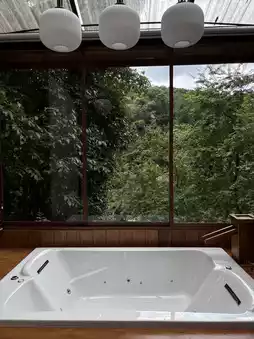 This place is quiet, peaceful, and private, suitable for both relaxing alone or coming with someone special, which is equally romantic. There is a Jacuzzi with a view of the large forest, a soft bed, and a corner for sitting and sipping coffee and reading a book in the morning.