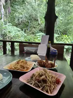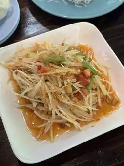 #GetDiscountsWithoutLuck We love going to Mae Kampong because we love the atmosphere, and our favorite restaurant for som tam is Sai Ua Mae Nim Mae Kampong. I have to say that the som tam here is delicious, with a flavor that's always the same every time. Order it with hot fried chicken, and it's absolutely amazing. They also have northern Thai food on the menu. Don't forget to try this restaurant.