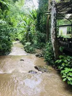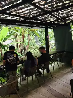 The most striking feature of this place is its incredibly natural setting. Nestled amidst the forest, a small stream flows through the premises, allowing you to hear the sound of the waterfall as you sip your coffee. The shop's wooden decor creates a warm, harmonious atmosphere. Seating is available both indoors and outdoors next to the stream, allowing you to fully enjoy the fresh air and tranquility of Mae Kampong.