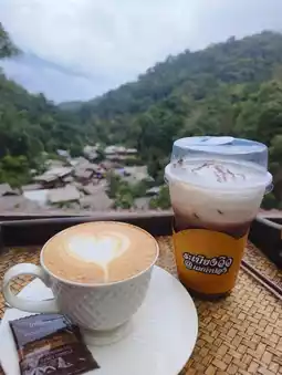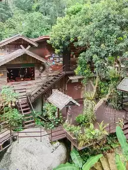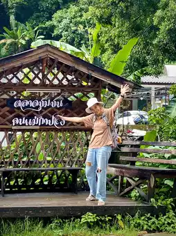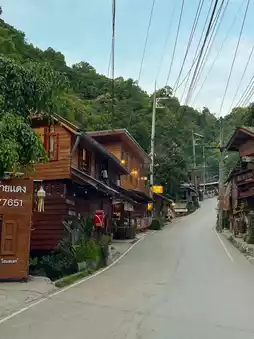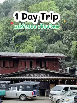 Mae Kampong is a small, eco-friendly village. 🛖🍃🪻 It's made up of cute wooden houses. You can spend half a day exploring the village. The top isn't very big, but there's a walking street, a temple, and a waterfall. After exploring, take a hired pickup truck up to the top. There's a cafe with a terrace where you can sit and enjoy the view. Drinks are only a few tens of baht ☕🎐, but the view is worth a million. Relax for an hour, check out this and that. We walked down ourselves. It's actually not far, but the way up is very steep. Taking a car is the right choice. 😂 The view is beautiful along the way, and you can hear the flowing water the entire time. It's so awesome! If you stay overnight, you'll be able to hear the sound of the water. Oh, and I forgot to mention, we drove up from Chiang Mai city. It's not very far, only about an hour. The road is steep and narrow, but not too steep. Small cars can make it up. 🚙