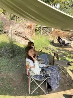 Hello, today I would like to recommend a cafe surrounded by nature and a waterfall. This is “WTF Coffee Camp” or Waterfall Coffee Camp, located in Pong Yaeng Subdistrict, Mae Rim District, Chiang Mai Province. The cafe is located in Kangsadan Resort, a little past the entrance to Mon Cham. You can set the GPS coordinates to go there. The cafe here is very special, which makes both Chiang Mai people and tourists have to follow, which is the waterfall right at the cafe. It is quite a large waterfall. The shop has seating with sunshade tents and camping chairs placed along the stream. There are also chairs for taking pictures at the waterfall. The atmosphere is great. Everywhere you look, it is green and shady. It is like relaxing in the middle of the forest. Breathe in the fresh air and put your feet in the cool water. It is a very rare experience. I recommend everyone to come here. There are many drinks to choose from, such as tea, coffee, and green tea. The entrance fee is 80 baht per person, but you can use it as a discount when buying drinks. For parking, you have to park at the resort below. Then there will be a golf cart to pick us up at the cafe.