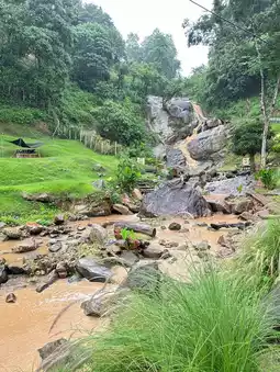 Chiang Mai is famous for having a lot of cafes. This time, we will take everyone to TWF Coffee Camp, a cafe that gives a camping feel in particular. It is located in a valley. It is a pity that we came on a rainy day, so the water is murky.