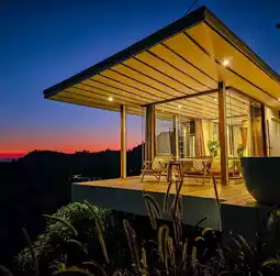 The sleeping area is surrounded by large glass windows on 3 sides.
