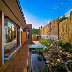 Outside, there is a waterfall garden on the walkway.