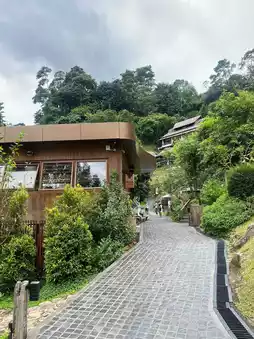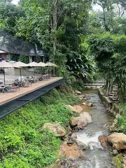 All seating is outdoors, but despite the outdoor seating, the air is cool and comfortable, with a constant breeze. Perhaps due to its riverside location, you can also enjoy the sounds of nature, waterfalls, and flowing streams.