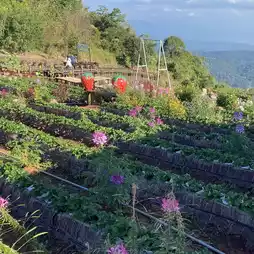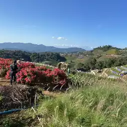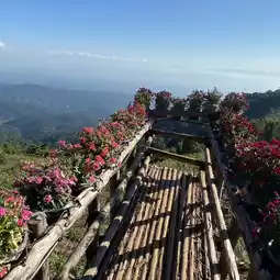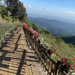 If you're in Chiang Mai looking for beautiful photo opportunities, the Mon Cham Skywalk is a must-see! Featuring a long bamboo skywalk, it feels like you're walking above a flower field. 🌸🌿 Everywhere you look, you'll see sweeping mountain views. The cool, refreshing air lasts all day long, making it a breathtaking experience. 🍃