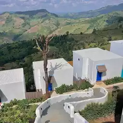 "Nontawa Villa & Cafe", a Santorini-style cafe in white and blue tones with cute corners for taking pictures. The atmosphere is nice and you can see a 360-degree view of the mountains. The shop is located on Doi Chang, Chiang Rai Province. Here, there are both rooms and a cafe and a restaurant. If you're not staying, you can stop by and chill at the cafe.