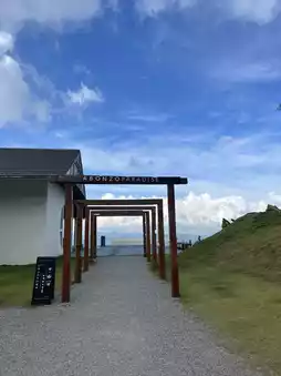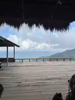 The cafe is located on a high hill, offering a magnificent view. We can see the mountains intricately, surrounded by a wide sky in a panoramic view.