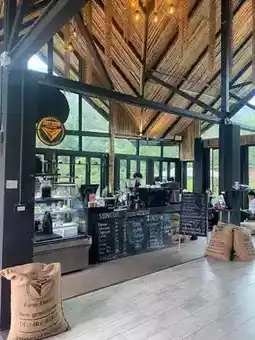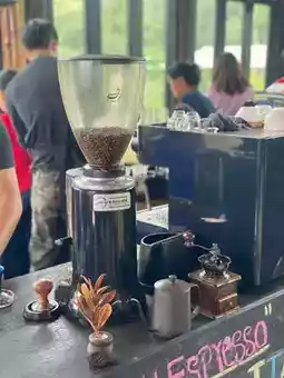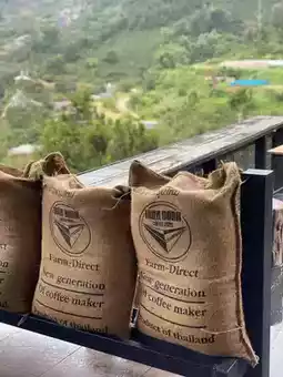 ..... The interior is decorated in dark, black tones, as the name suggests. There's plenty of seating to choose from, and it's airy and spacious. There's counter-bar seating for sipping coffee and enjoying the Doi Chang view. Plus, there's a cute gimmick: coffee sacks are used as chairs, creating a chic touch. ☕️