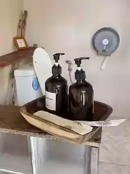 • 🌅 The accommodation is surrounded by tall, lush trees, with morning mist and the sound of a nearby waterfall.