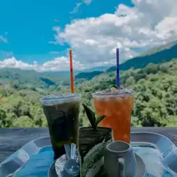 This place offers accommodation, food, drinks and desserts. Sit and eat while enjoying the view. It's very good. 🥤🌲🍃