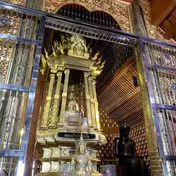 ✅ Magnificent Lanna-style architecture adorned with intricate carvings, elegant wooden patterns, and shimmering gold accents contrasting with classic dark wood floors.