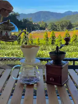 The accommodation has food for you to order, such as grilled pork to eat in the evening, which goes well with the atmosphere. In the morning, you will have a breakfast set of rice porridge, which is delicious. There is also a drip coffee set, which is really good.