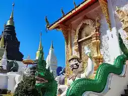 • The temple's exterior features a grand ubosot (ordination hall) and a large viharn (viharn), intricately decorated with multi-tiered, lacquered, and gilded roofs decorated with Thai-Lanna motifs.