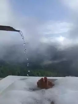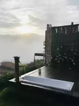 ✨ The weather is chilly at night and in the morning, fog drifts in front of the accommodation. The accommodation is a large tent with a fan inside, and outside, there's a bathtub, fireplace, speakers, and a water heater. The space is very spacious, with clear divisions between the sleeping tent, dining area, bathroom, and bathtub. It's very quiet and perfect for a relaxing getaway.