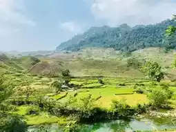 - The next morning I took the 7am trip from Moc Chau to Ba Khan Hoa Binh, . Going from Moc Chau to Ba Khan, if you take a Limo, you get off at Phu Cuong intersection, then call a taxi to continue into Ba Khan resort, about 13 km away, the taxi fare is also very cheap (120), the surrounding rice fields are green and very beautiful. If you are fascinated by Ta Dung, Dak Nong but have not had the chance to go, Ba Khan is also a good choice. Ba Khan sells entrance tickets for guests who do not stay at the resort and rents rooms by the hour, everyone can choose to suit their time.