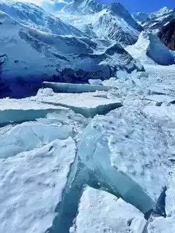 Here, glaciers and glacial lakes coexist. The deep blue ice at the glacier's terminus is breathtakingly beautiful and should not be missed.