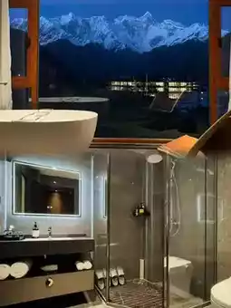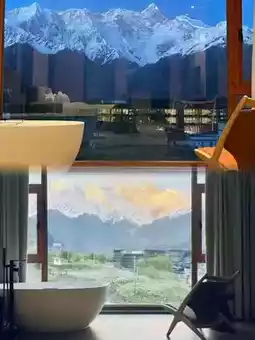 The resort is diagonally opposite the cultural square of Suosong Village in Milin, offering an unparalleled vantage point to overlook Namcha Barwa Peak and the Yarlung Tsangpo Grand Canyon. A 3-hour drive from Nyingchi city takes you through the scenic Nyang River area, where snow-capped mountains, forests, and villages alternate, immersing you in Tibetan landscapes even before arrival. The resort's parking lot is right at the entrance, and as you step out, the gleaming snow peaks of Namcha Barwa loom in the distance, filling the air with Tibetan ceremonial grandeur.